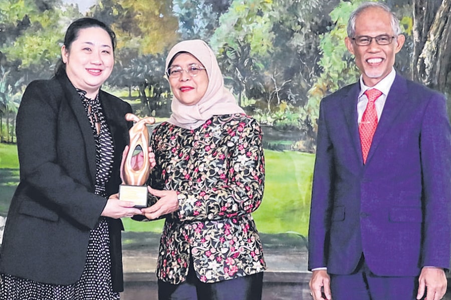 担任陈笃生医院关怀与辅导部主任的高级首席医疗社工柯淑芬(左一)从哈莉玛总统(中)和社会及家庭发展部长兼卫生部第二部长马善高手中接过新加坡杰出社工奖的奖杯。(海峡时报)