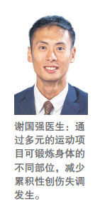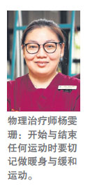 杨雯珊说,在运动过程中, 一旦察觉身体有任何疼痛,应 该停止造成疼痛的特定锻炼,但 可以继续那些没有引起疼痛的运 动。她解释:“一项运动可牵涉 到好几种不同的锻炼项目,因此 人们须要弄清楚是哪一个特定的 锻炼项目造成疼痛,并暂停这项 运动。如果疼痛仍然持续,就应 该停止所有运动,询问医生或物 理治疗师有何建议。”