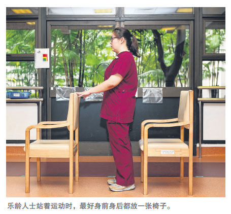 - 当站着运动时,最好在身后手 可以触及到的距离内放一张椅 子,有需要时年长者随时可以坐 下来休息。身前也可以放一张椅 子,让自己随时可以握住加强平 衡,避免跌倒。