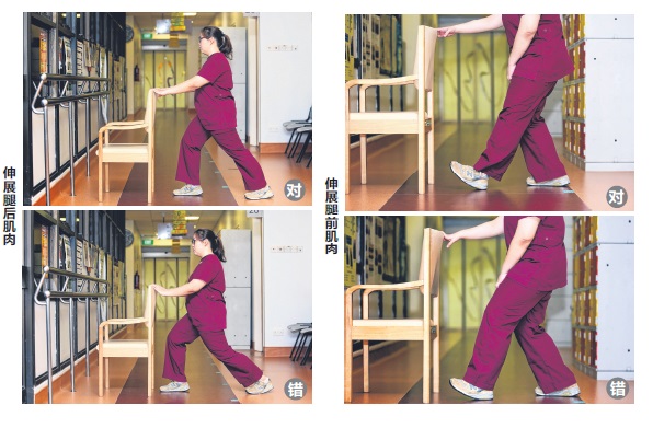 伸展腿前肌肉:双脚一前一后站立。伸直前腿并弯曲后