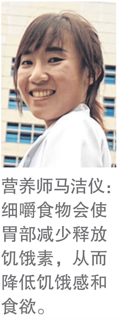 马洁仪说, 饥饿素(ghrelin)是 一种主要在胃中分泌的激素,它会向大脑发出饥饿信号, 提高食欲。有研究显示,更频繁地 咀嚼食物会减少释放胃饥饿素,进而降低饥饿感和食欲。这可减少能量摄入,并有助于体重控制。