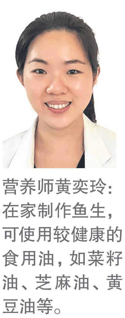 如果在家自制鱼生,可考虑使用单不饱和脂肪或多不饱和脂肪含量较高的食用油,如菜籽油、芝麻油、黄豆油、葵花籽油或玉米油。要提醒的是,虽然这些脂肪被认为是健康脂肪,但因为卡路里含量高,应酌量使用, 以免导致体重增加。