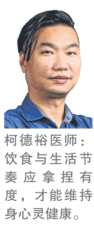 此外,食物选择应该以量和质为考量。 柯德裕医师从食物的“量”说起,“过量进食会撑着肠胃,影响消化,所谓有口福却无缘消受。食物的‘质’则是因人因时因地做选择。”他说,“因人”是指自身的体质,咀嚼食物的能力与消化能力而定。“因时”以宏观来说是顺应 一年四季,以当季食物为首选; 微观则是一天的什么时候做什么事情,包括进食时间以促进脾胃功能。