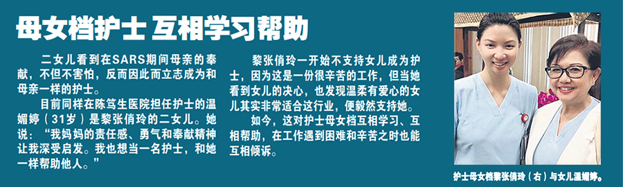 在陈笃生医院与中区社康联盟医疗中心工作的 高级护理组长黎张俏玲(63岁)当护士已有43年。 她的父亲是一名医生,而母亲一直以来的梦想都是 成为一名护士。奈何,她母亲生活的年代并不鼓励 女子外出工作,她因此替母圆梦,成为了一名护 士。