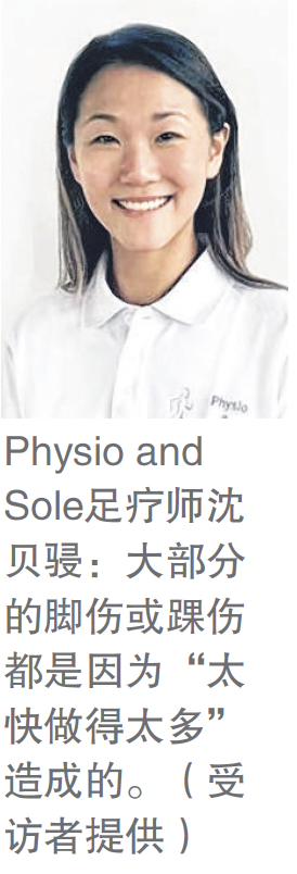 沈贝骎指出,大部分的脚伤或踝伤都是因为“太快做得太多”(doing too much too soon)所导致,例如平时久坐不动,出国旅行时却一连多天走了很多路,身体习惯不来。正因如此,她指出:“像足底筋膜炎(plantar fasciitis,又称跑者足)这类损伤,常常发生在放假 时或度假后。同样地,如果很快地投入一项新运动,没有给身体足够时间调整过来,也会有类似损伤。”