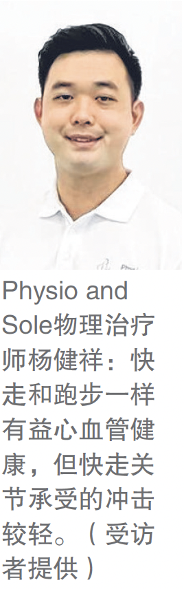 物理治疗与足疗诊所Physio & Sole Clinic的物理治疗师杨健祥说,如果跑步会导致膝盖或双脚疼痛,可考虑快走。快走和跑步一