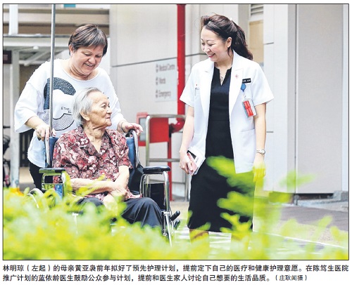 负责在陈笃生医院推广预先 护理计划的顾问医生蓝依龄(45 岁)受访时说,该计划让人们通 过讨论,提前安排自己未来的医 疗和健康护理。“病人病情严重 到无法和家人沟通时,家人至少 能遵照病人的意愿做安排。”