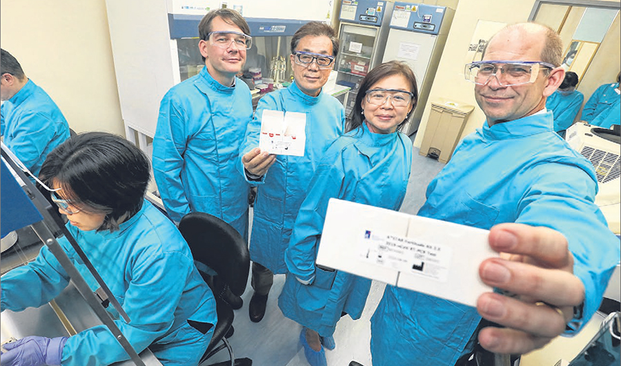 陈笃生医院检验医学科高级顾问医生巴克亨(右起)、医疗诊断发展中心总裁余雪妮博士、实验药物研发中心 医疗诊断部主任井上雅文,以及生物资讯研究院副院长(研究)莫勒—斯特罗,联合研发并在市面上推出检测 冠病的试剂盒。 照片设于今年2月,试剂盒当时刚推出不久。(何炳耀摄)