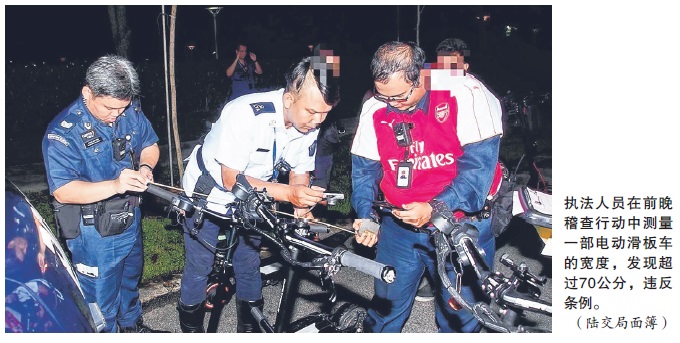 陆交局前晚也连同警方和国 家公园局,派了60多名便衣执法 人员到榜鹅一带,展开大规模稽 查行动,一晚内取缔20多起违例 案,没收了11个代步工具,其中 一个超重两倍,近60公斤重。