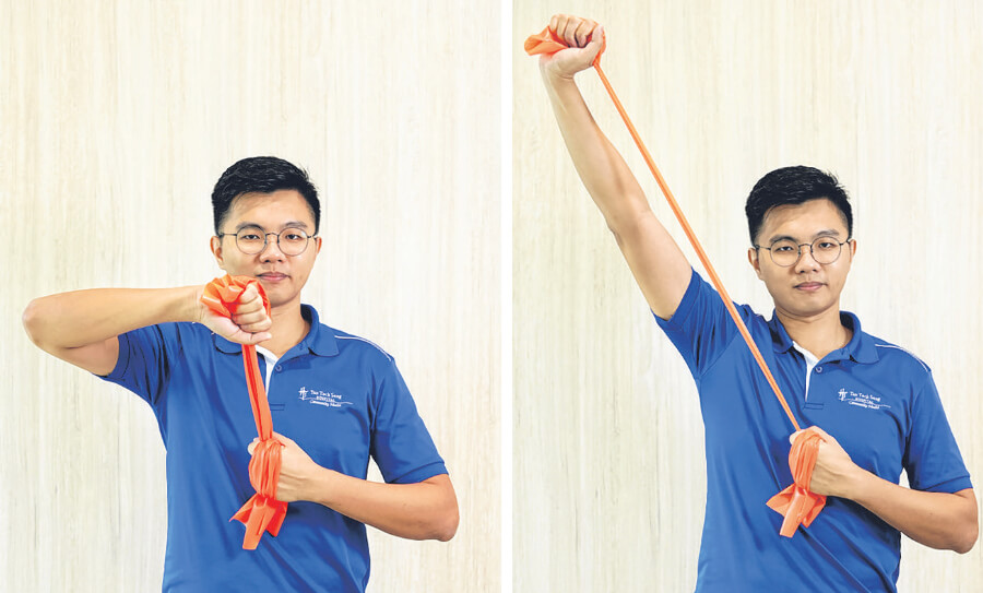 双掌缠绕弹力带,置于胸前,接着向上拉伸至手臂完全伸直,维持10秒。恢复原来姿势。重复10次。换边做。