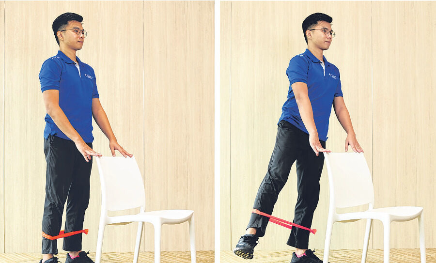 脚踝上方缠绕弹力带,双脚与肩同宽,单脚向外移动,维 持10秒,恢复原来姿势。重复10次。换边做。若平衡欠佳,可扶着椅子练习。