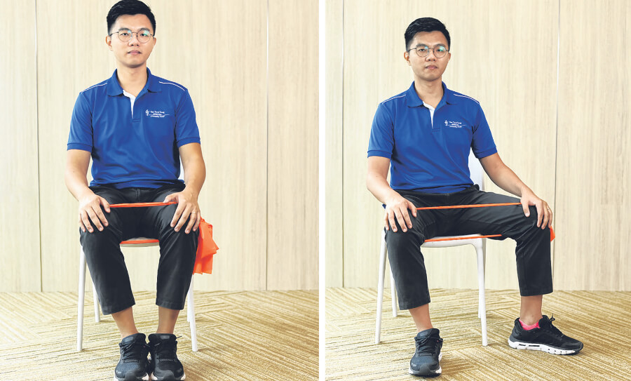 把弹力带套在膝盖上方,膝盖与髋同宽。双膝慢慢向外移动至动作极限,维持10秒,恢复原来姿势。重复10次。活动时保持上半身挺直。