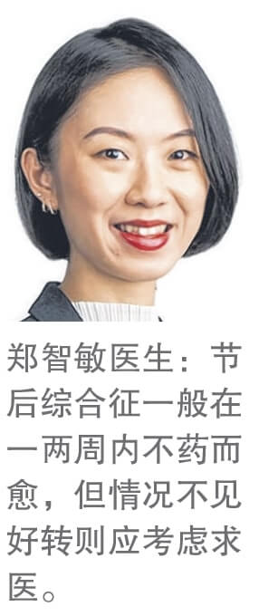 林佩欣认为, 单是接 受并承认节后综合征是一种 正常而普遍的经验,就能让我们感觉好一些。此外,培养良好的自我照顾习惯,包括定期运动,确保饮食均衡营养,睡眠质量佳。“听起来像老生常谈,但真的会有显著 的奇妙作用。”