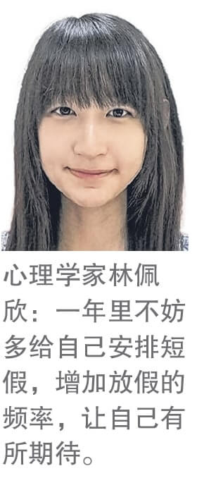 另外,记得给自己安排放松 或享乐的时间。研究显示,单是期待放短假(即不超过两周的假期)的心情,就足以让我们摄取正能量。林佩欣建议,一年里不妨多给自己安排短假,增加放假的频率,“无论是独处时间,或 和重要的人共享时光,都能让我们有所期待。”