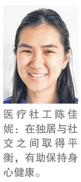 如果不习惯独居,陈笃生医院社区保健团队的医疗社工陈佳妮建议给自己时间慢慢适应,不必急着做出太大改变,一步一步来,例如首先可尝试做自己没有做过的事,比如去联络所参加活动,或去自己从没去过的地方走走,还是和常在咖啡店碰到的邻居打招呼。重要的是保持开放心态,愿意接受新想法和观点。她说: “给自己足够 时间找出感兴 趣,或觉得有意义的事。必要时也要主动联系亲友,在独居与社交之间取得平衡, 有助保持身心健康。”