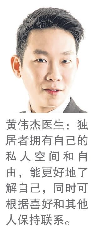 黄伟杰医生坦言,他开始独居生活时,也有些不适应。他认为对策之一是建立个人日常习惯。每天起床后,他首先安 静地反思,把 焦点放在正面 的想法上,例 如感恩自己能 拥有个人空间,特别是在 房价居高不下的时期;接着整理床铺,打 开收音机,然后读报纸。晚 上入睡前,他同样会有固定 习惯,包括做简单的瑜伽伸展, 并再次把思绪集中在正面思考。