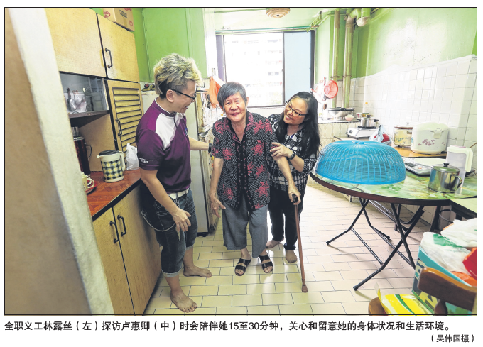 目前,由林露丝负责的案例 共有20个。她每天平均要到四个 受益人的住家进行家访。75岁的 卢惠卿是由她照料的年长者之 一。
