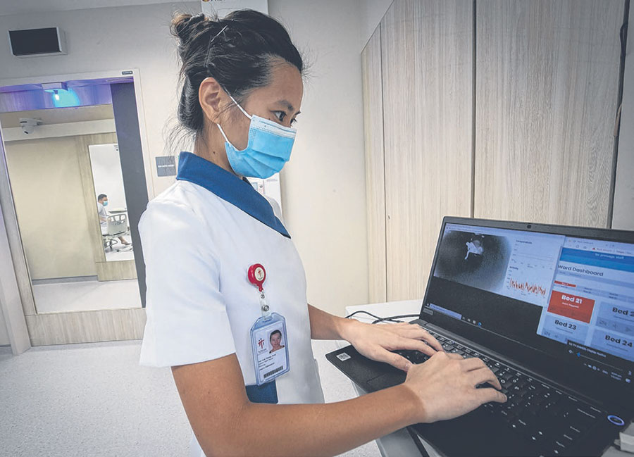 陈笃生医院高级护士陈淑婷在病房外用电脑工作,当病患要下床时,电脑荧幕会出现热图,警报发出声响,呼 叫她去协助病患。(陈来福摄)