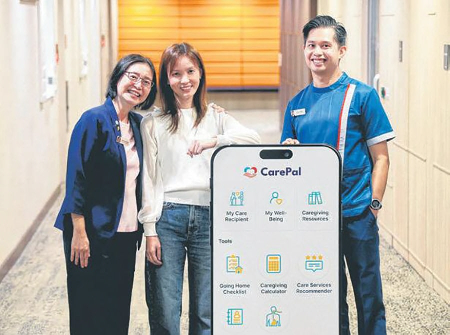 看护者林秋君(中)认为 Carepal平台对于新手而 言非常有用。左为陈笃生医 院护理副主任程依瑜,右为 陈笃生医院高级护理研究 人员格拉斯。(联合早报)