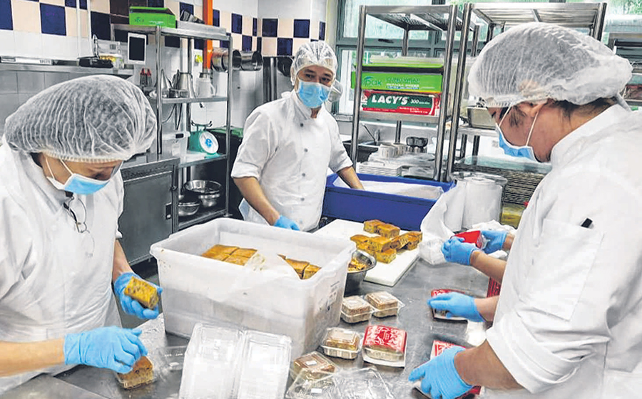 MANISAN KHAS BAGI PESAKIT: Kakitangan dapur TTSH membungkus kek dengan kad ucapan perayaan khas.