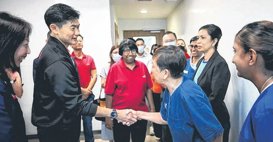 >ேதசியத் ெதாழிற்சங்கக் காங்கிரசின் (என்டியுசி) துைணப் ெபாதுச் ெசயலாளர் ெடஸ்மண்ட் டான், டான் ேடாக் ெசங் மருத்துவமைனயில் உள்ள மூத்த ஊழியைரச் சந்தித்து ைககுலுக்கினார். படம்: ஸ்ட்ெரய்ட்ஸ் ைடம்ஸ்