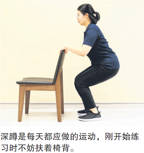忽然失去平衡时也可以保持身体挺直。‘坐到站’及深蹲能够让我们更好地从马桶或蹲式厕所站起身。”