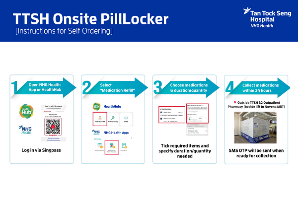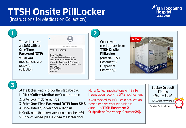 We have made medication collection even more convenient with the Onsite PillLocker at TTSH. Located just outside the B2 Outpatient Pharmacy, the PillLocker allows you to pick up your medications within 24 hours after receiving your SMS notification. You can choose to collect your medications via the Onsite PillLocker by placing your order through HealthHub or the NHG Health App.